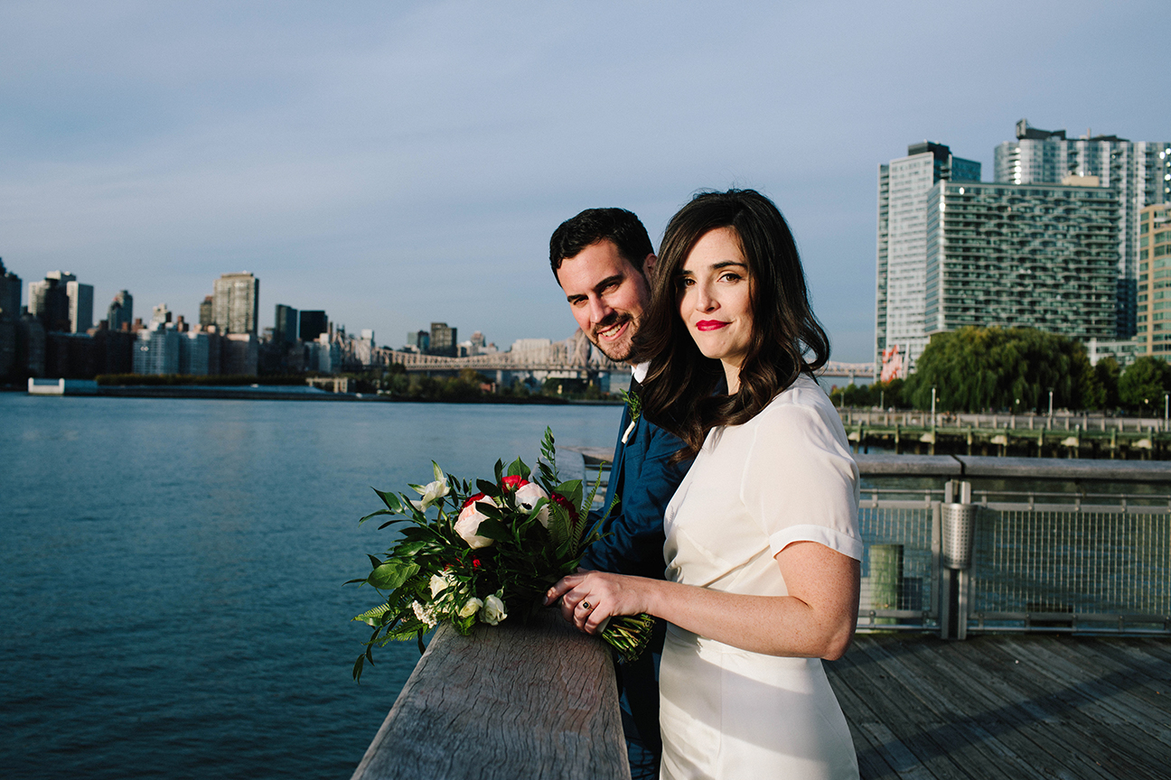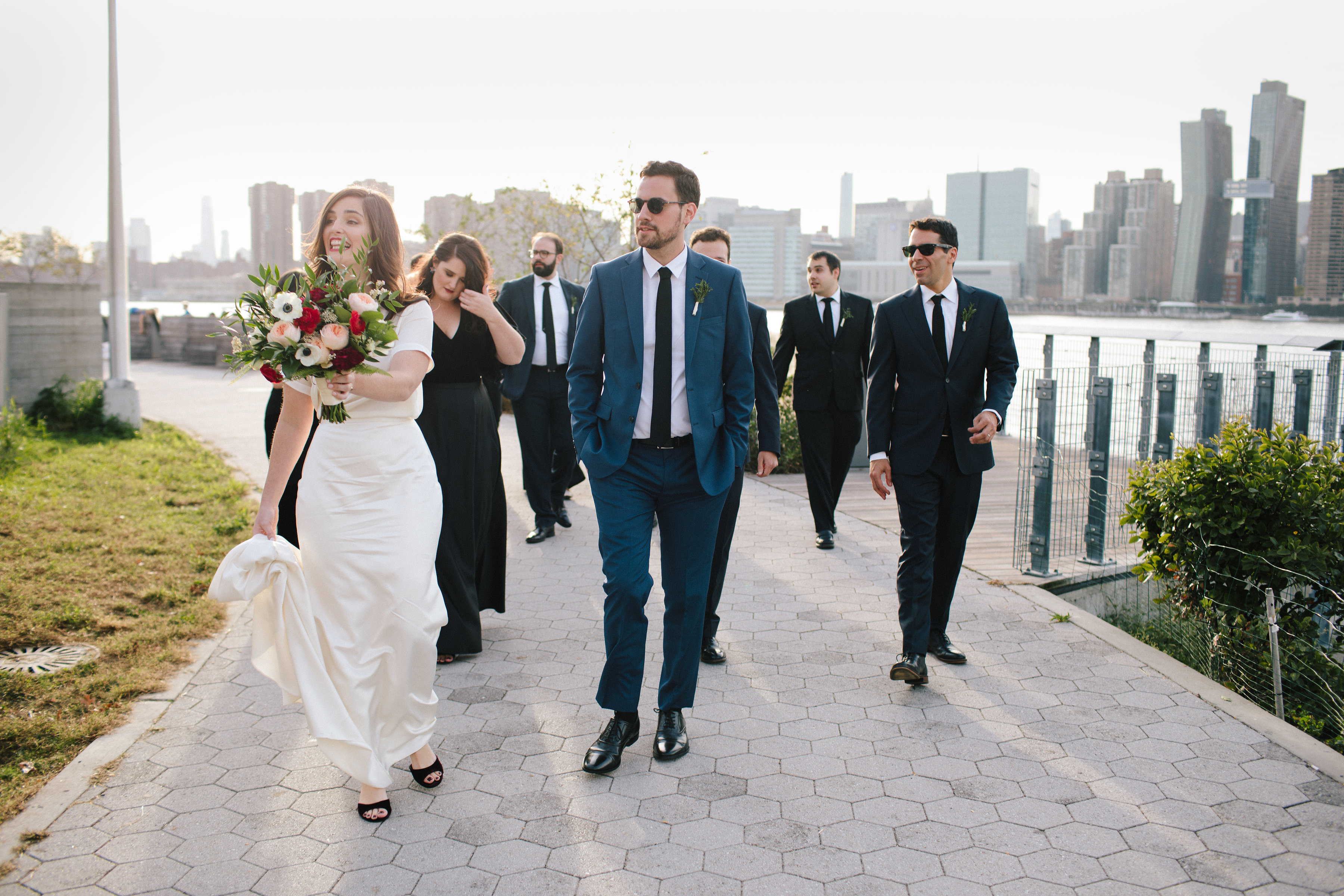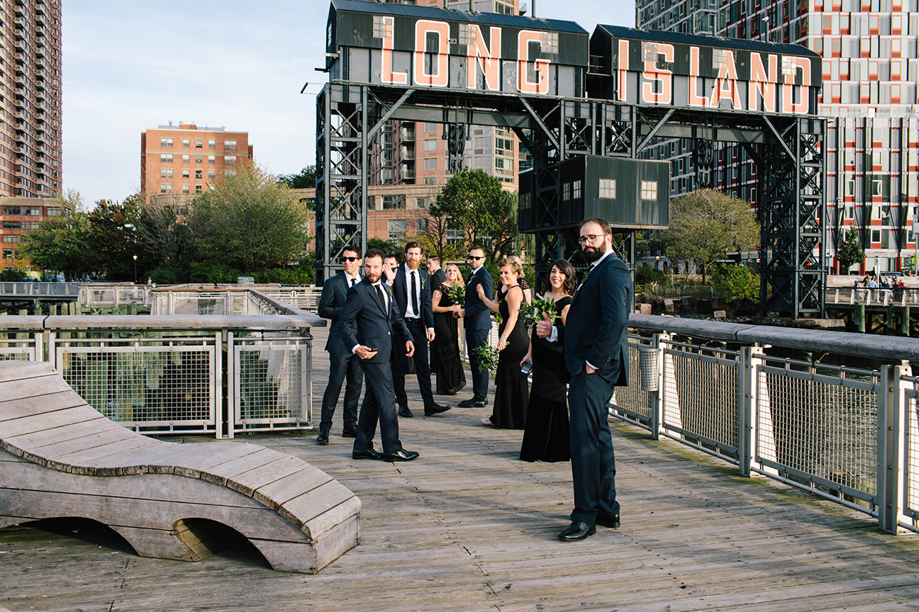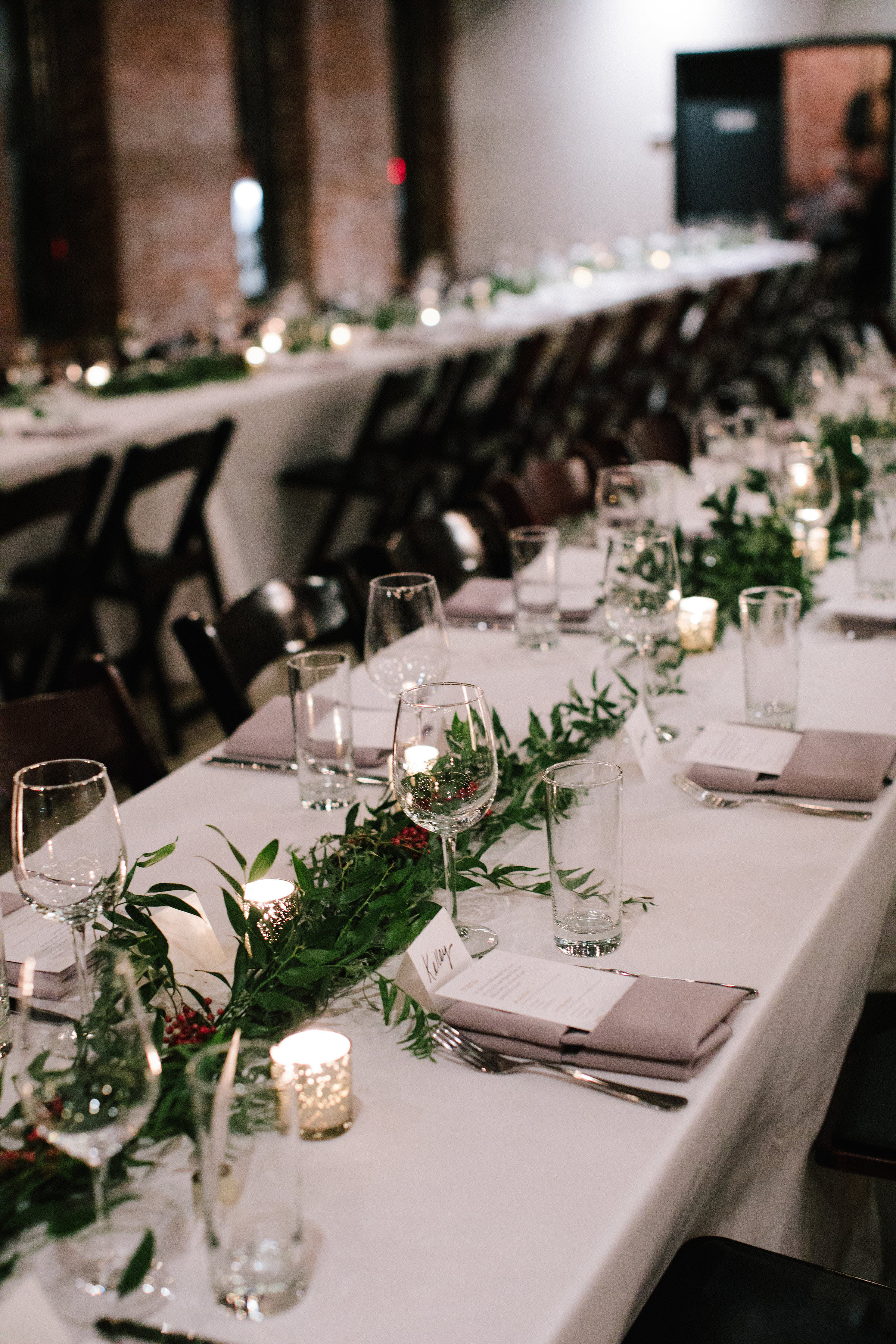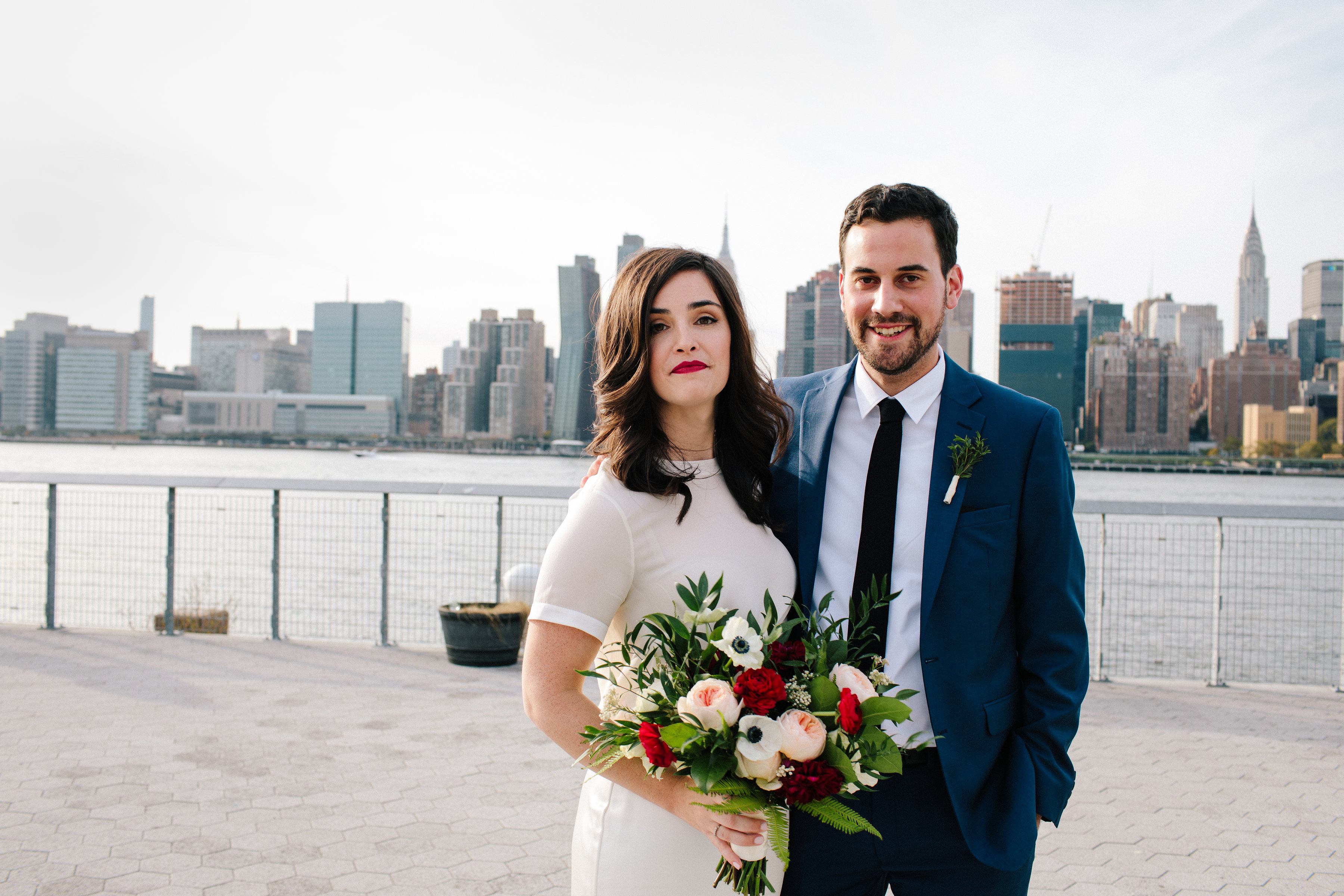 An effortlessly chic bride and groom, Kelley and James, casually walked along the Long Island City waterfront making their way to the Gantry Loft.  With just a few pops of red, this bride wanted all green everything. Ferns, greenery installations, and candles lining the tables made for an intimate evening for family and friends to enjoy.