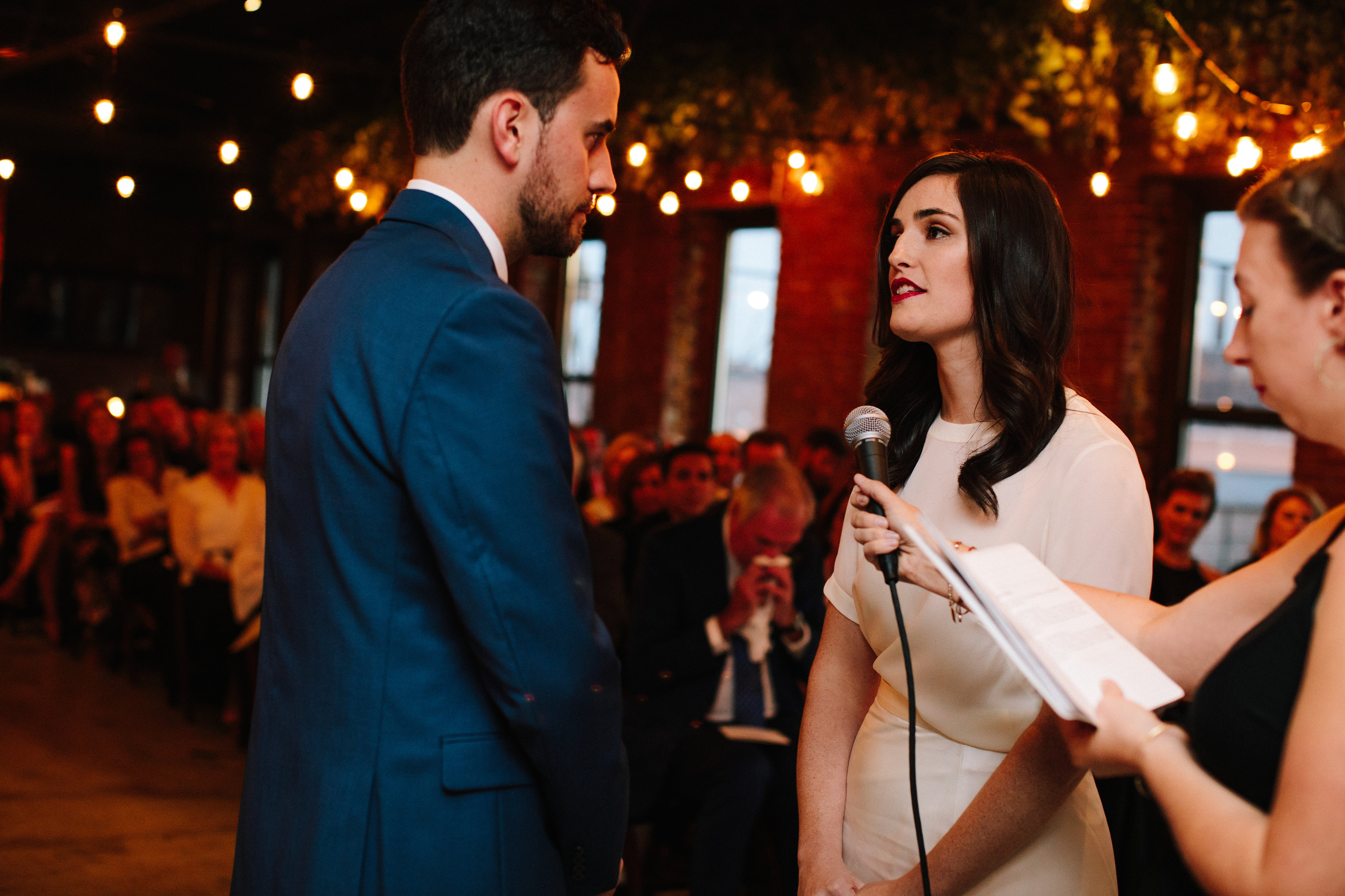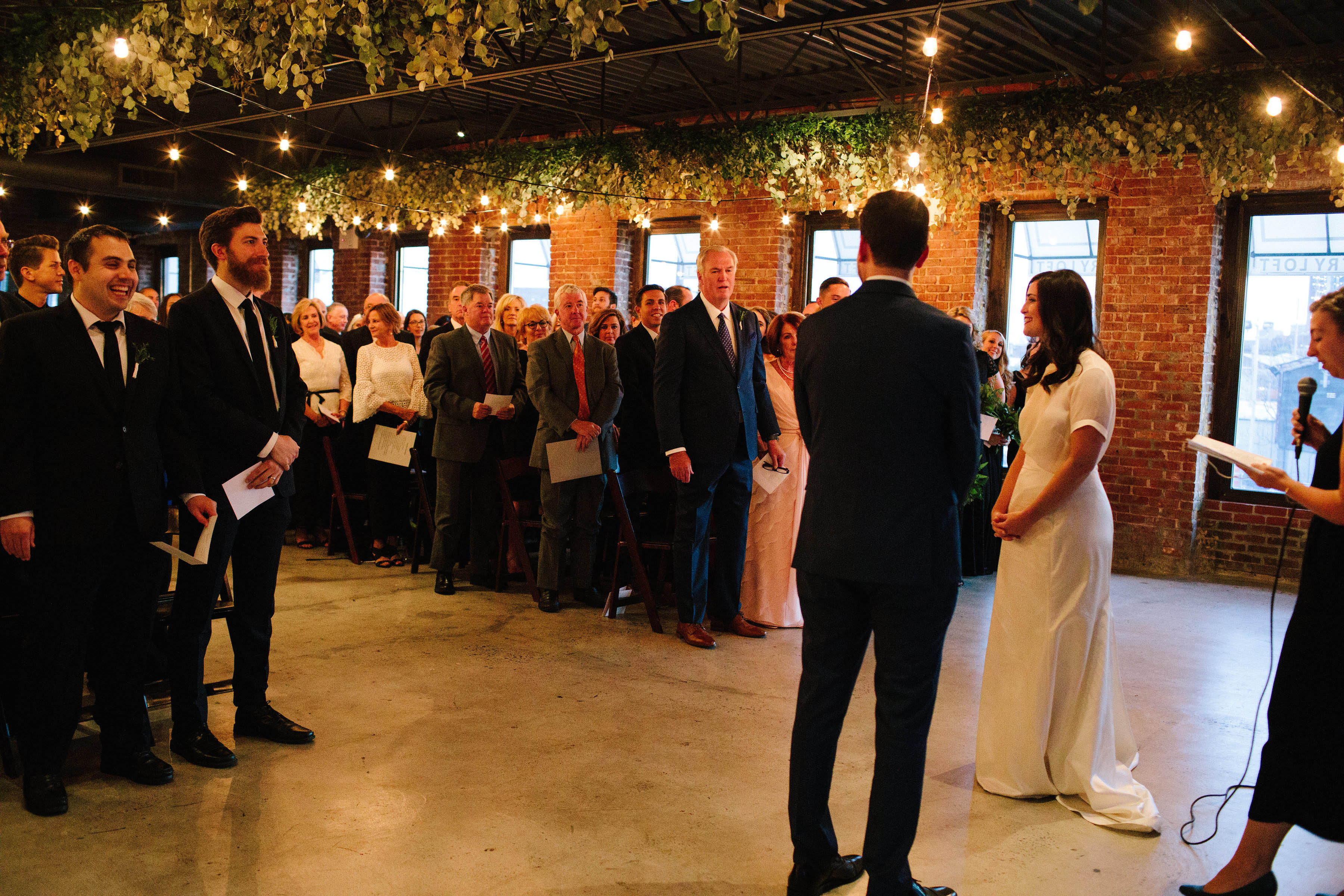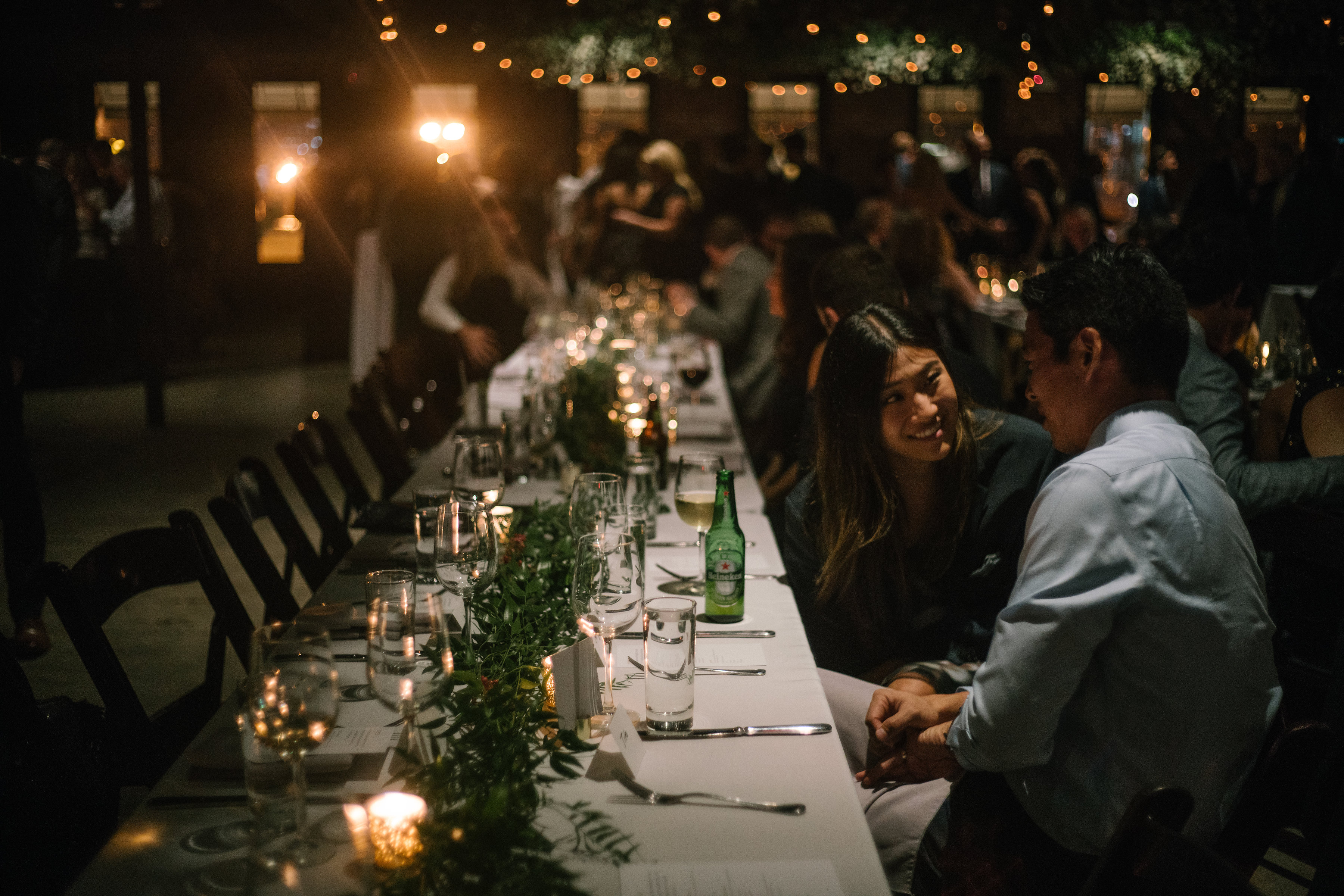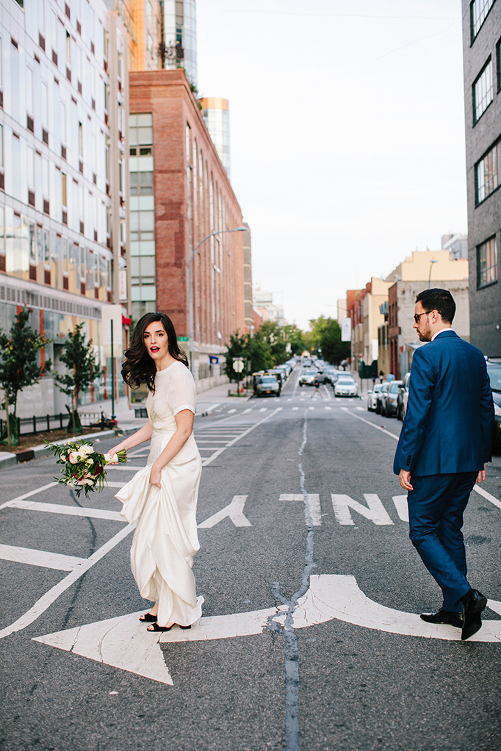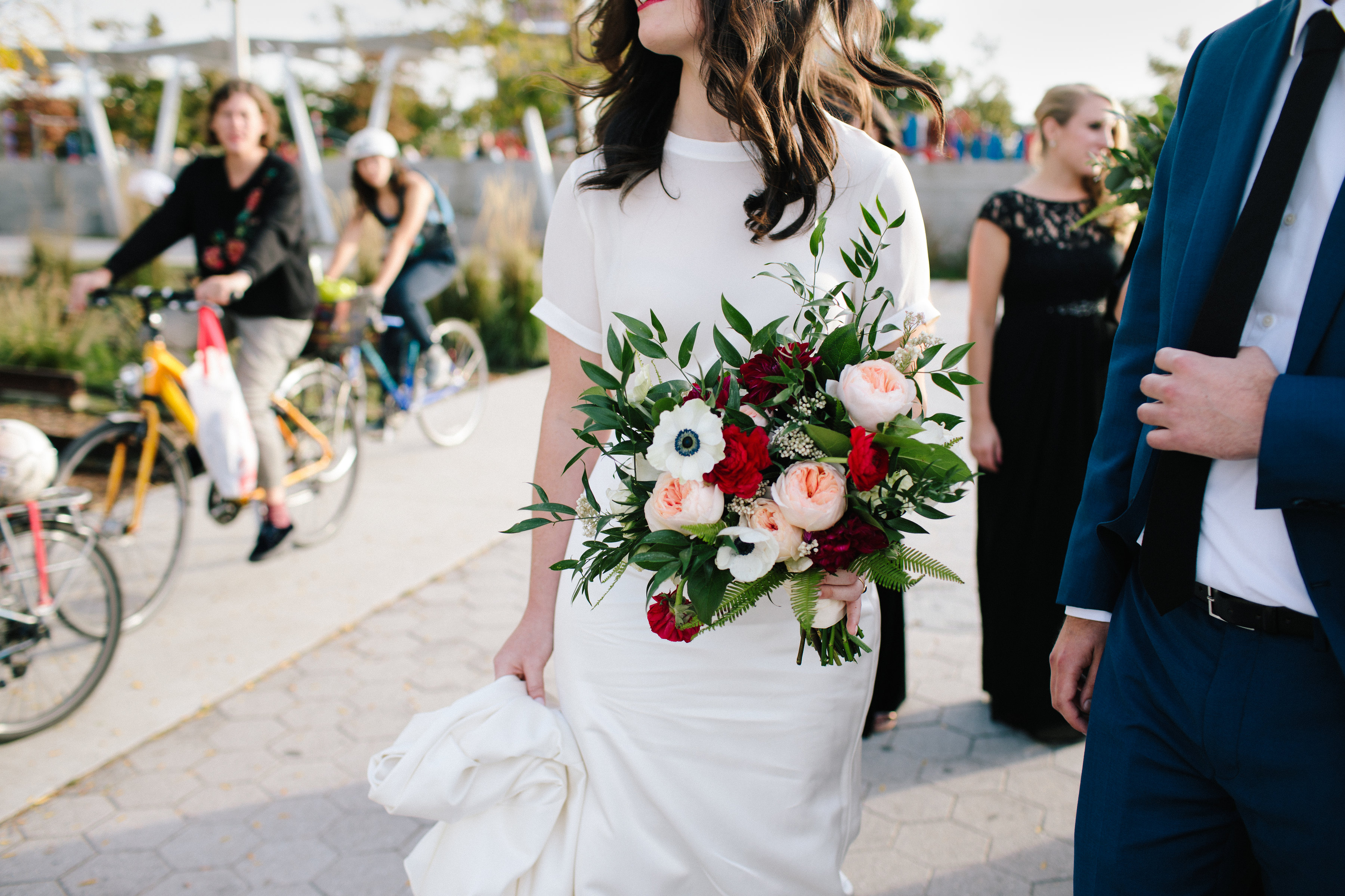 An effortlessly chic bride and groom, Kelley and James, casually walked along the Long Island City waterfront making their way to the Gantry Loft.  With just a few pops of red, this bride wanted all green everything. Ferns, greenery installations, and candles lining the tables made for an intimate evening for family and friends to enjoy.